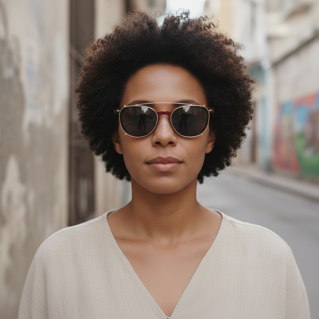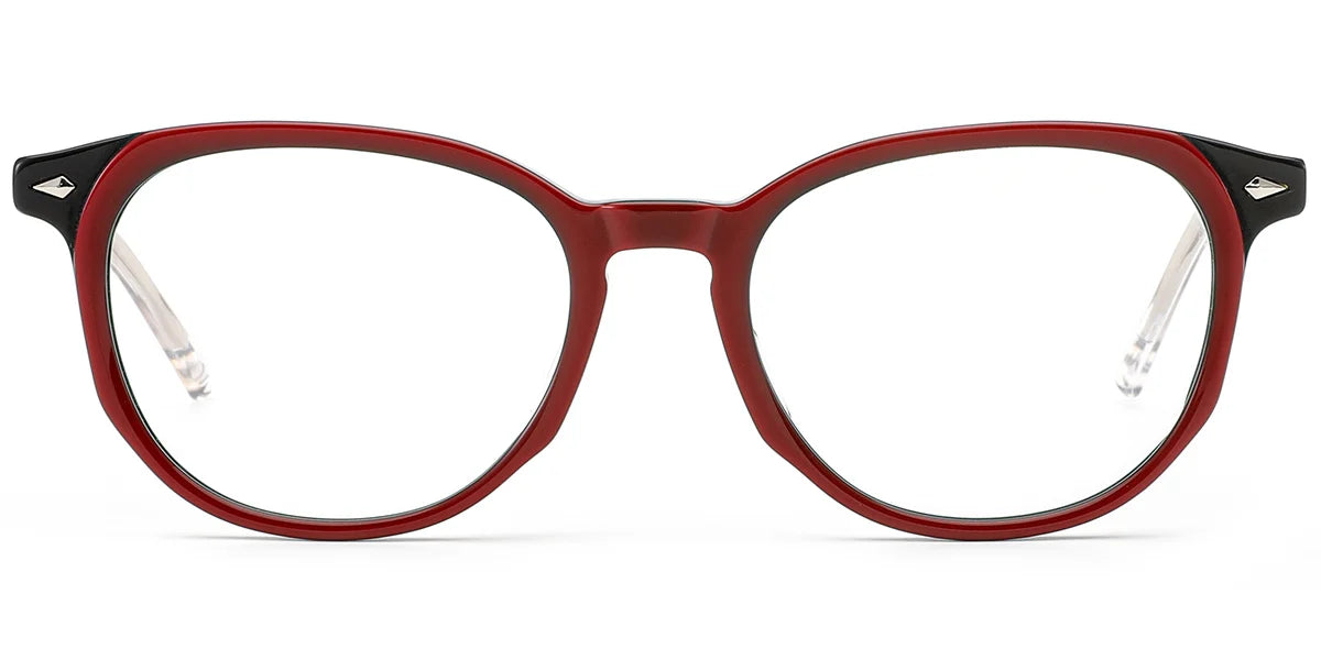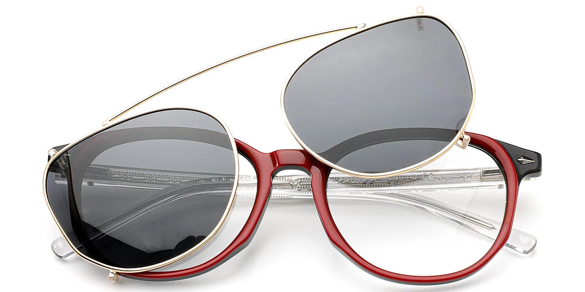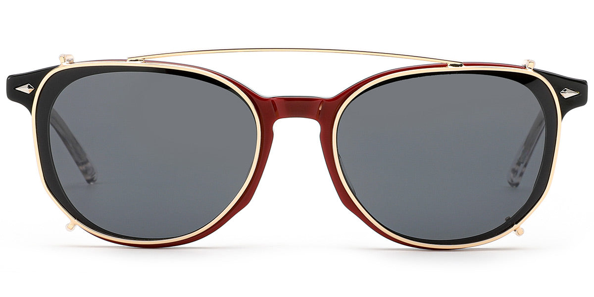 Su frente en acetato bicolor —rojo profundo con negro— aporta carácter sin exagerar, mientras que las varillas translúcidas equilibran el diseño con ligereza y modernidad. Incluye clip-on solar desmontable, perfecto para pasar de interior a exterior sin cambiar de lentes.