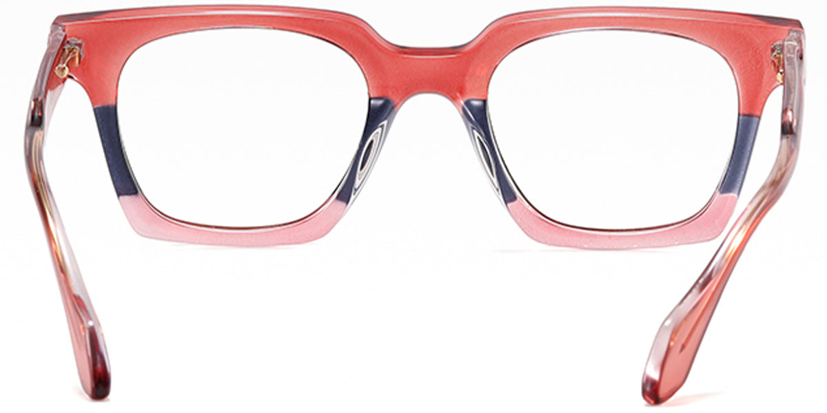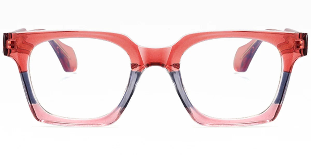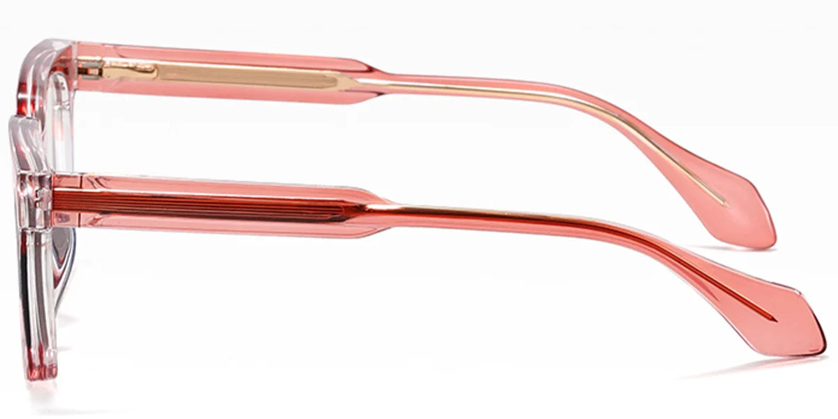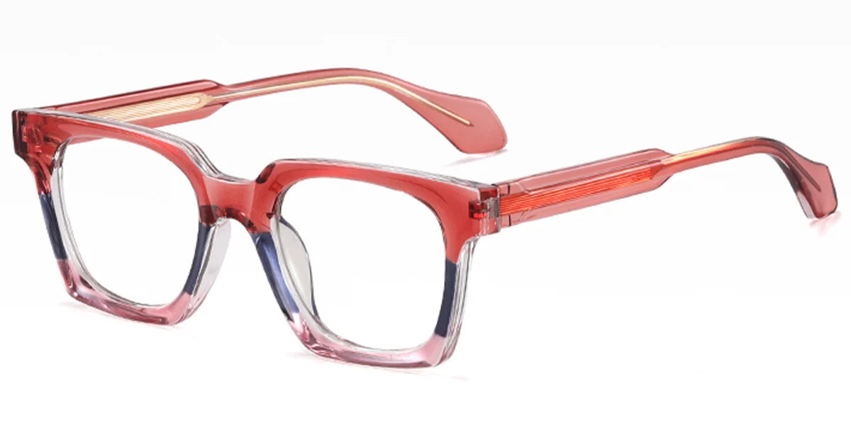 Una montura translúcida en tonos rojo y rosado que suaviza la forma sin perder presencia.